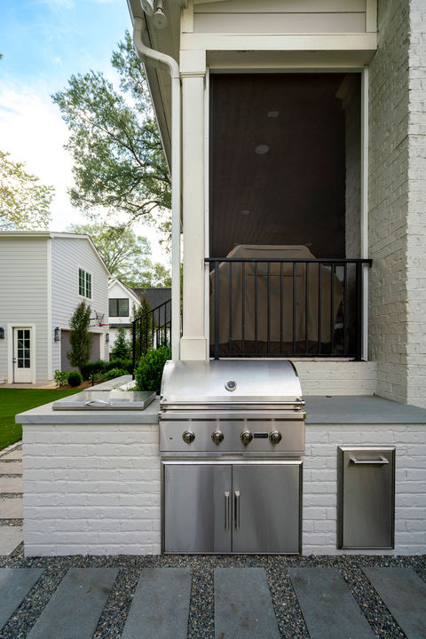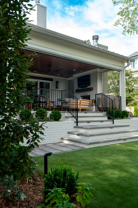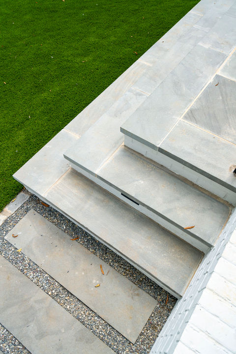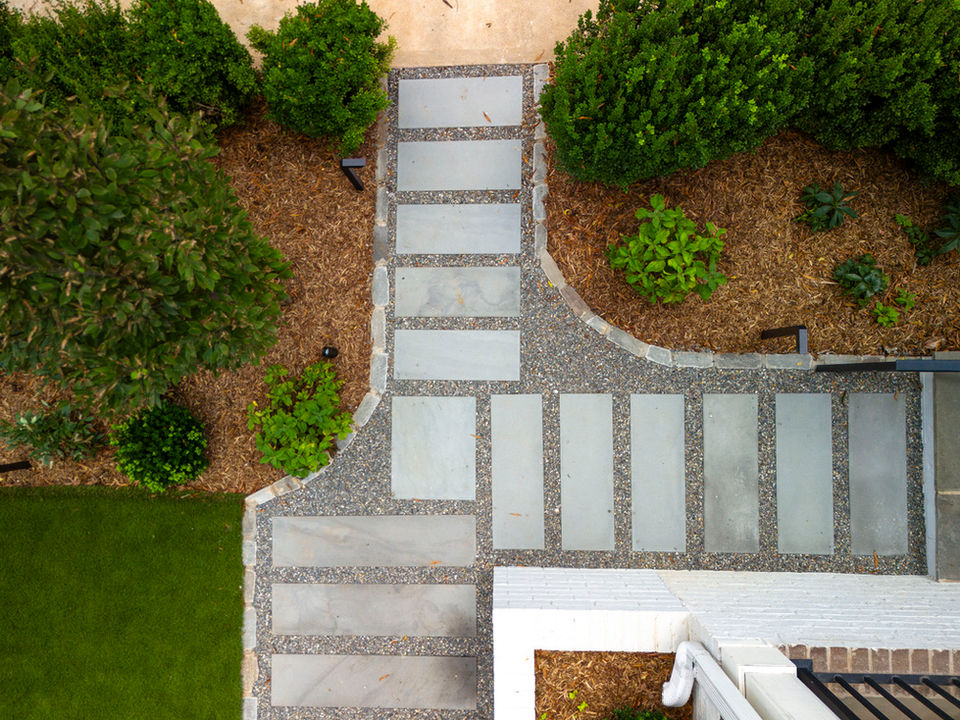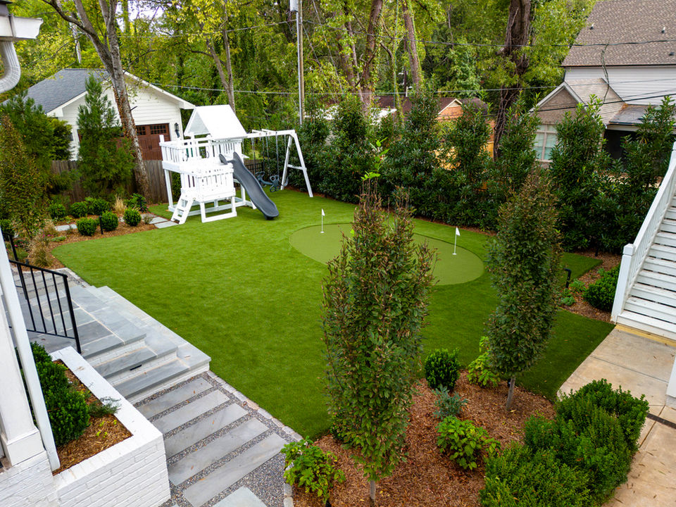 A connection between the upper patio and lower lawn can be difficult. How do you make a large grade change feel like one fluid space? This was the primary task. A custom hardscape step system was designed for ease of entry into the back yard. This included new railings, cascading church steps and bluestone and gravel path ways that lead to points of entry. We recover some lost space on the last side for a “Dad moment” outfitted with a grill station, ice bin and fire pit. A small pollinator garden and path lead to the kids play set. In the center is the putting green with illuminated putting cups. Another soft planting screen conceals the driveway from the yard.