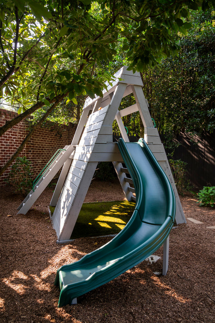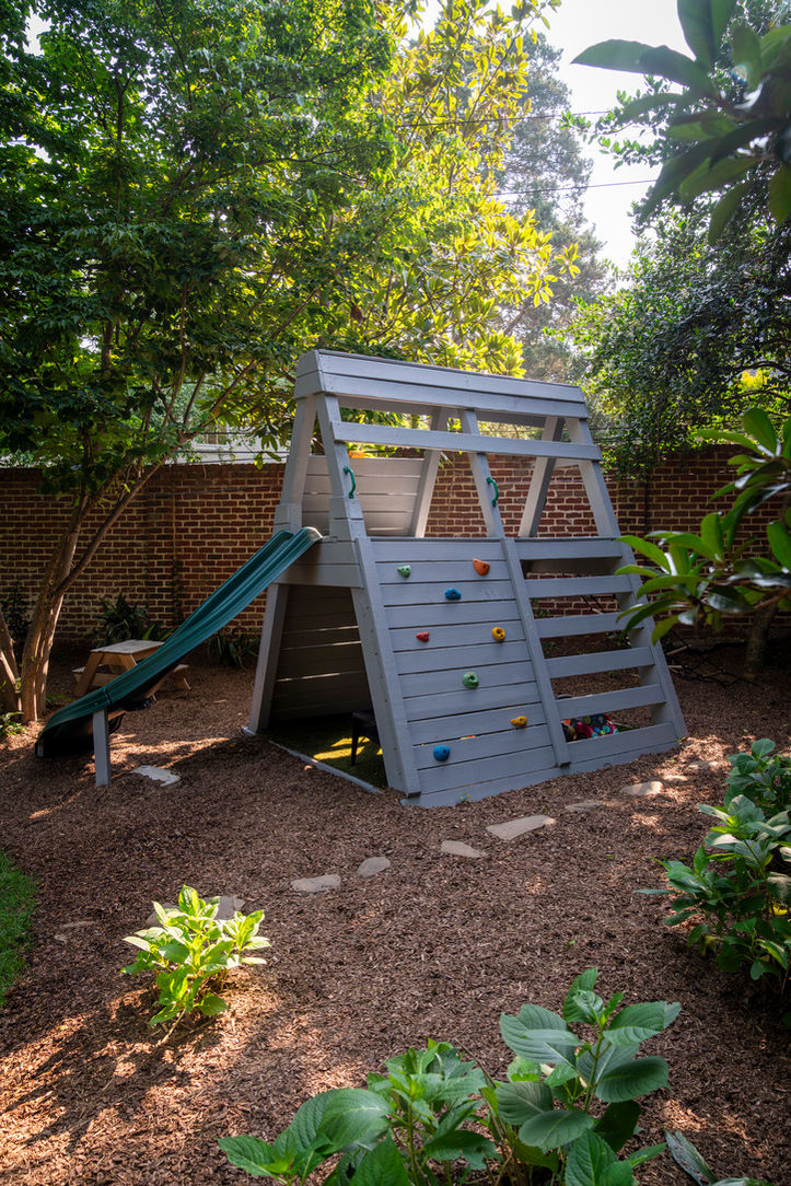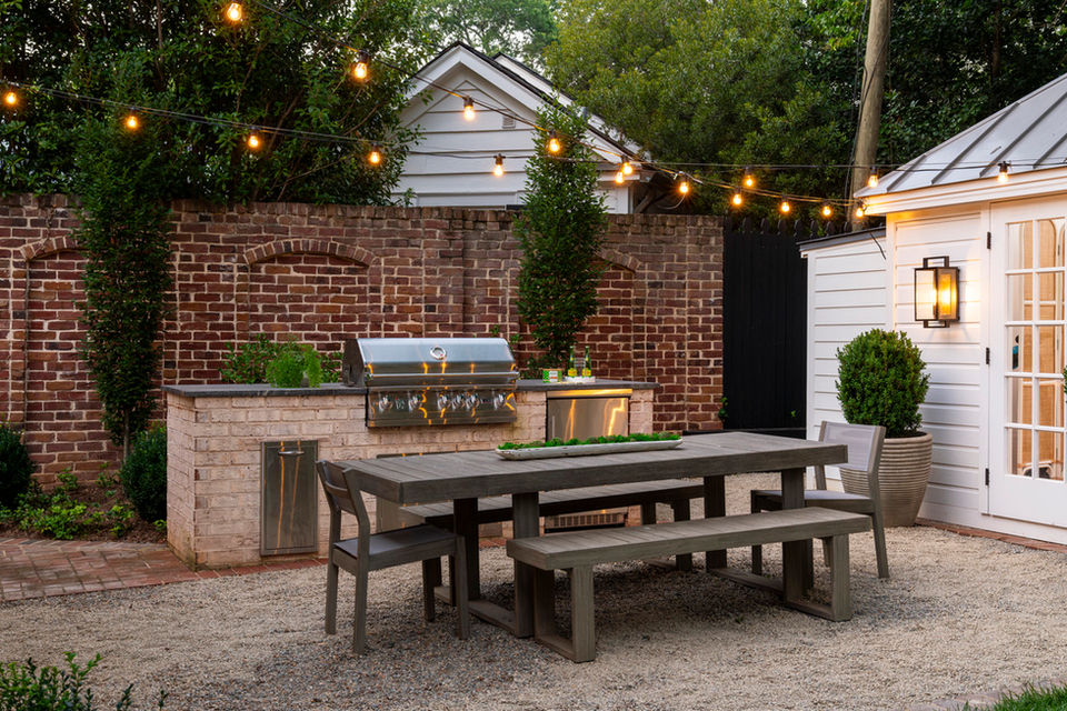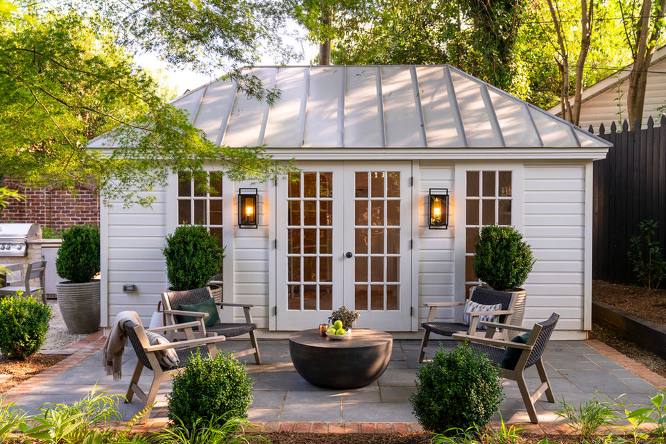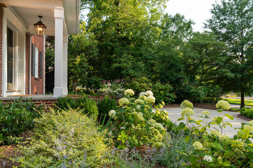 Full master plan for a property renovation in Myers Park. The Landscape design plan embraces the original driveway with a formal planting refresh. A gravel path to the right and new gate lead guests to the back yard. The back property includes a custom Hillbrook collection office, outdoor kitchen, bluestone patio and new landscaping throughout. Completed with a full furniture & accessories package this space was installed complete to KFiles Design vision