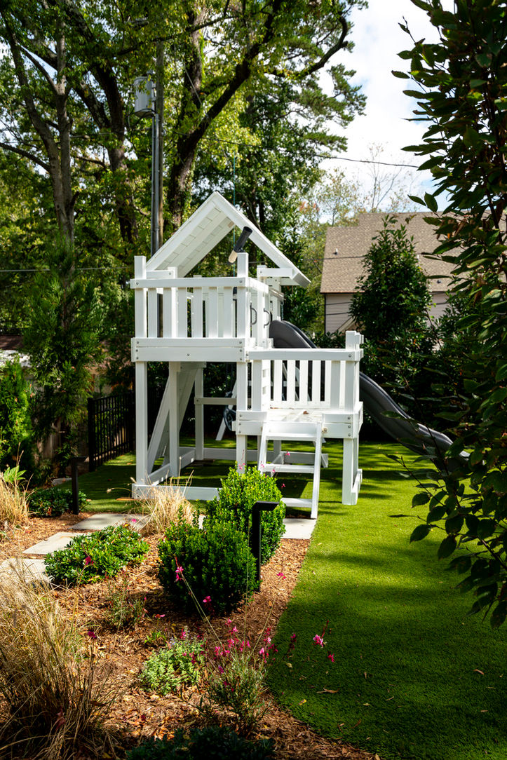A connection between the upper patio and lower lawn can be difficult. How do you make a large grade change feel like one fluid space? This was the primary task. A custom hardscape step system was designed for ease of entry into the back yard. This included new railings, cascading church steps and bluestone and gravel path ways that lead to points of entry. We recover some lost space on the last side for a “Dad moment” outfitted with a grill station, ice bin and fire pit. A small pollinator garden and path lead to the kids play set. In the center is the putting green with illuminated putting cups. Another soft planting screen conceals the driveway from the yard.